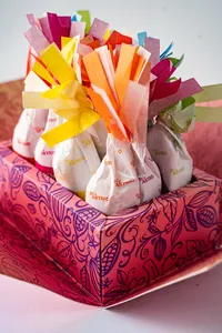 Chocotejas rellenas de manjar de olla y seis sabores: clásica, maní, limón confitado, guindón, café y praliné.